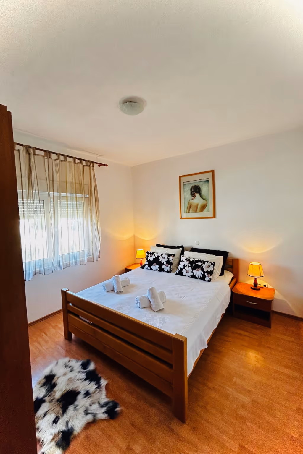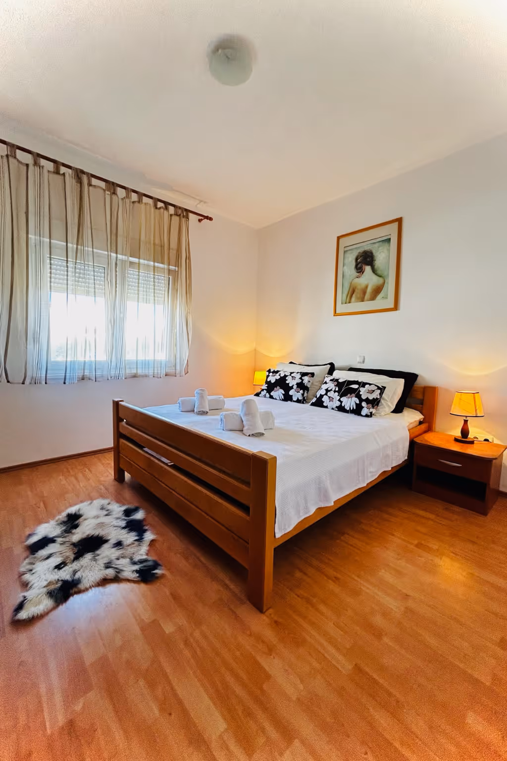 Mit einem geschmackvoll eingerichteten Schlafzimmer und einer komfortablen Schlafcouch im Wohnbereich bietet das Apartment Maslina den idealen Rückzugsort für Paare oder kleine Familien. Der großzügige Wohn- und Essbereich ist offen gestaltet und die voll ausgestattete Küche lädt zum gemeinsamen Kochen ein. Eine große Terrasse mit Blick auf die mediterrane Umgebung rundet das Wohnerlebnis ab – Ruhe, Leichtigkeit und Genuss inklusive.