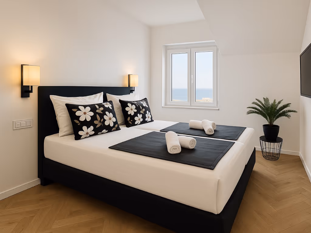 Unser Highlight: das exklusive Penthouse-Apartment Mediterana. Mit drei Schlafzimmern, zwei Bädern, einem separaten WC, zwei Balkonen mit Meerblick, voll ausgestatteter Küche und Smart-TVs in jedem Zimmer bietet dieses Apartment höchsten Komfort. Klimaanlage, Waschmaschine, Bügeleisen – alles, was Sie für einen unbeschwerten Aufenthalt brauchen.